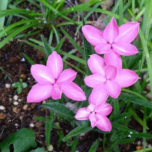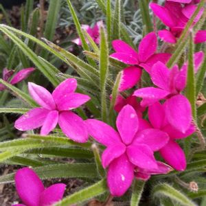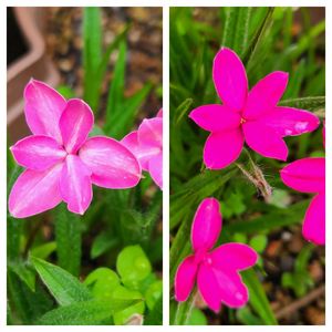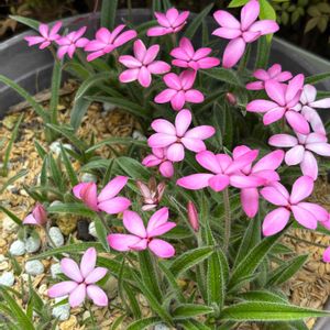 我が家の〜🪴 〜🩷アッツ桜🩷〜 キンバイザサ科 ビビットピンクが可愛いんです💘 3年前に株分けして、1鉢はご近所さんにお嫁入り、我が家は2鉢 毎日、お花が増えていくのを見るのが楽しいです💕 門扉の上から🙄 青空にピンクも映えました🩷