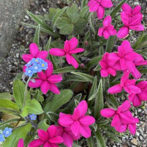 突然葉っぱが出て咲き出すアッツ桜。 今年も色濃く咲いてくれています🩷 可愛い😊 零れ種のワスレナグサも一緒に。 ワスレナグサ、意外といろんなところに種がいくのか、不思議なところから咲いてくれます。 葉っぱが特徴的だけど、不慣れだと雑草と間違えるかも。 うっかり抜くにはもったいない。 白が少なめなので、白だけは意図的に種を取り蒔きしています。 それでも青の方が強いらしく、断然青多め。 やっぱり原種に近い方が丈夫なんでしょうね。