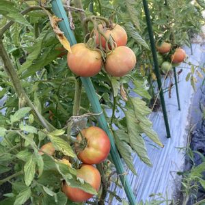 中玉サイズのトマト🍅 前に鳩🕊️が来て2個収穫前に食べられてしまったので、カバーして過保護に育ててます♡