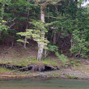 増水時に根元が川に洗われてこの状態に。がんばれ。