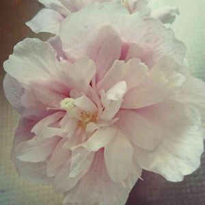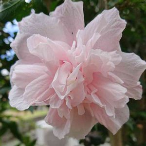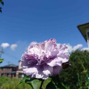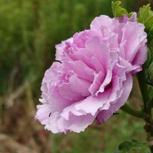 八重咲きの薄紫色のムクゲの花。 葉巻虫がたくさんついてあまり元気でないのだけれど、ぽつぽつ花を咲かせています。