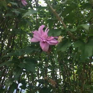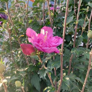 ムクゲ ピンクデライト 奥には 紫玉 暑さのためか小さなお花になってます 小さな株の小さなお花 ✧( ु•⌄• )◞◟( •⌄• ू )✧
