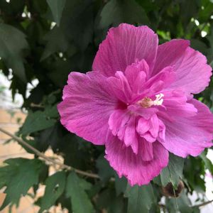おはようございます😃道端で見つけました。 ご存知の方いらっしゃったら教えて下さい🙇♀️ →教えていただきました! 八重のムクゲでした。GS初心者なので勉強になります😊