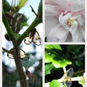 夕方、ムクゲの花を撮ろうと近づいたら、あちこちの枝でこんなことになっていました❗️ アップのpic撮ろうとするとトコトコと枝の裏に回ってしまいます。飛ぶ気はないのかな?としつこく追いかけたら、やっと飛んで行きました。 2種類いるみたいですけど、いったい何が大発生❓️😱