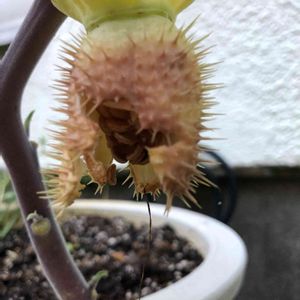 朝鮮朝顔の実 トゲトゲの 実が できました。実の下に 真っ直ぐに 茶色の紐 何だろう? これ引っ張ると パカーンって 種が 出てくるの?
