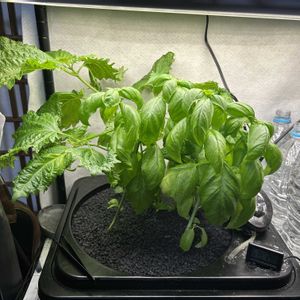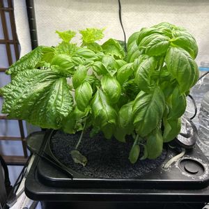 バジル育ってます!既に上はカットしました。横から生えてくるのを今後は収穫していきます。 左奥だけシソです。水耕栽培のせいか、馬鹿でかい葉になってます。