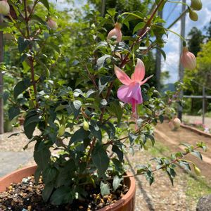 フクシアが お花付けはじめてくれてるんだけど ずっと 4本の枝しかなくて これって勝手に分岐してくれるのかな?? 色がほんとかわいい🐰