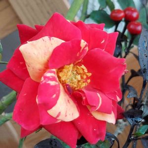 こんにちは☀️😃❗ ミニバラ コルダーナ** 品種不明だけど、めちゃ大輪🌹 綺麗に咲いてるなぁ~💕 それと… うっすら色付き始めたクリスマスホーリー♫