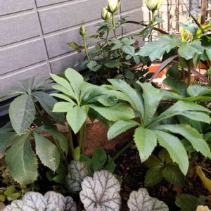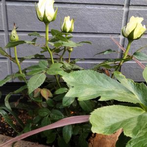 ミニバラ コルダーナ 日陰エリアだけど 手前のクリスマスローズに埋もれず 大きく大きく育ってほしい