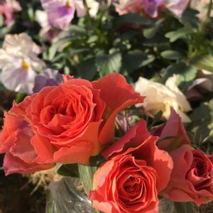 ミニ薔薇が競演してくれています。 苗鉢だったモーニングブルーオプティマも幾つか蕾をつけて、花開き始めました😊 今季の開花が終わったら、植え替え予定ですが、いまはまだ敢えてポットのままで育てています。