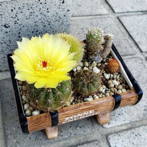 こちらもサボテンの寄せ植え。😄✨ 玉サボテンのお花が咲いています。😃🎶 頑張ろう❗日本‼️ 👊✨