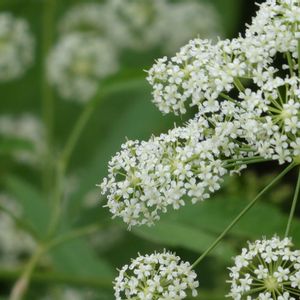 ドクゼリ セリ科ドクゼリ属 多年草 別名はオオゼリ 山地の湿地などに生育する。 葉の形はセリ科特有の細い葉で、花は球状に集まり、10個前後が茎の先端に集まる。 人の背丈ほどになる。 名前のとおり猛毒である。 花期7〜8月