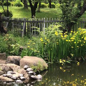 横浜三ツ沢公園の池で🐢💚 亀さん甲羅干しの山☺️ と黄色い花菖蒲💛