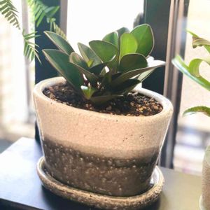 こちらも昨日仲間入りのペペロミア。ゼブリナを枯らしてしまってから赤っぽいこんもり系を探していました。 早速植え替え。お気に入りのこの鉢もやっと活躍できて嬉しい😊