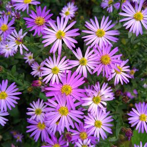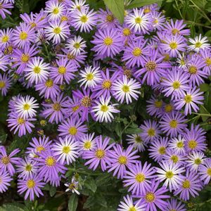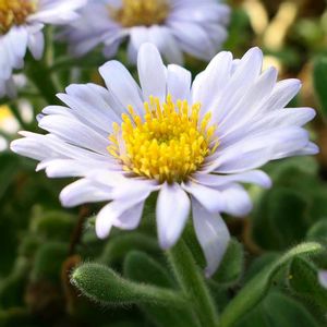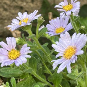 【ダルマギク(達磨菊)】 日本原産、キク科多年草 本州西部と九州北部の海岸の岩場などに自生する。 海岸の岩上に咲く様子がダルマが座っているように見えるところから名付けられたとか、丸い葉をダルマに例えたなどの由来がある。 花のつく茎はよく枝分かれして高さ約25㎝になり、径3~4cmの頭花を枝先につける。頭花は淡い青紫色の舌状花と黄色の管状花からなる。 葉はロゼット状につき、全体が毛に覆われているため白緑色をしている。 草丈:20~35cm 開花時期:10~11月 花色:淡青紫色、白色 山口宇部空港