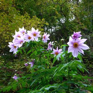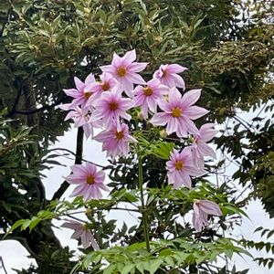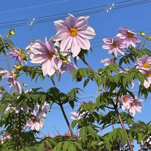 皇帝ダリアが咲いていました。 花期は11月~12月ですから、これからの花🌼ですね💕 草丈は2m~3mありそうです🎵 花径は約15cmで、中心部の頭花が黄色く、8枚の花びらは薄紫がかったピンク色をしています💞😃