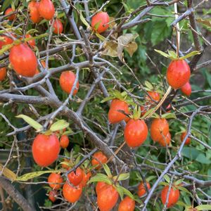 初めて見た赤い実❤️よーく見たら先がとんがってる❓美味しそう🧡🎶 箱入り🍊📦を持って親戚巡り🚗 💨運転中 赤信号でプラタナス並木をパチリ📸 うちの鉢植え🪴モミジ🍁紅葉しました🍁