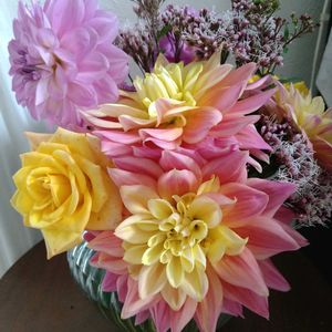 バラ🌹ダリアを雨の降る前にと、慌てて切り落としたら花瓶3つ分になりました🎶