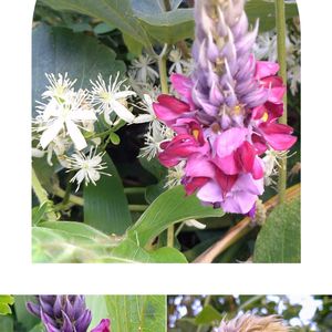 ① 今日のお花🔸クズ🔸 何でも覆い尽くしてしまう蔓は脅威ですが、花は香り良く綺麗で、色合いが変わるのも魅力です🩷💗💜 (9月上旬撮影) ② ヤブマメも庭や畑に生えると蔓が絡み付いて困るので抜いています🤣 これは道端のヤブマメ🤍💜 ミズヒキとコラボして綺麗です💓 ③ 今年はたわわに実ったアオツヅラフジを見つけました💙🎶