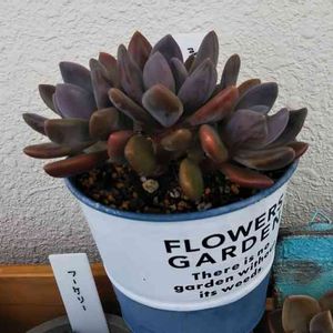 おはようございます🍀 今朝も曇り空☁ 昨日は久しぶりに暑かったですね💦 節電中なので、扇風機使えないので窓全開でした😅 今日の多肉ちゃん🌱 「紫麗殿」 植え替えした方が良さそうなんだけど…春に植え替えしようかな😅 鉢の正面を気にせず植えてしまったので…曲がってます😂 許してね🤣🤣🤣