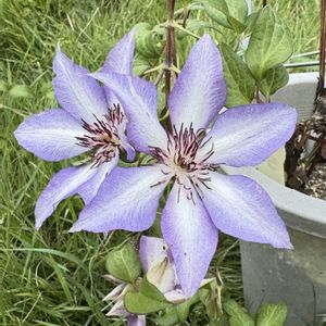 ◯クレマチス◯ミサヨ 剪定後の2番花が咲きました。藤色と白のコントラストが綺麗な花です。 美佐世は生育旺盛なイメージがあります。上手に育てたらきっと大株になり、沢山の花を咲かせそうなので来年は地植えにしてみたいと思います。