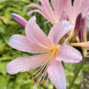 ◯夏水仙◯ 母が植えた夏水仙があちらこちらで咲き始めました。夏水仙、別名はリコリスともいうのかも。 雨上がりの1枚です。花びらの先の方にほんのりとブルーがのります。 今年は雨も少なかったのに、知らない間にスクッと伸びて蕾をつけていました。