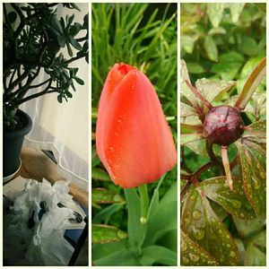 説明いたします⤴ 右から・・・ 芍薬の蕾 咲きそうなチューリップ 無駄に出したティッシュ ティッシュの犯人は、能天気に寝ております🐱💦