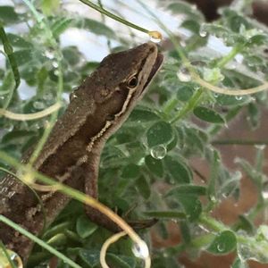 この間 脱け殻を発見した時はぎょっとしたけど。 近寄っても全然逃げない。 子どもかな。舌をぺろぺろ出して水飲んでた。 ナメクジや芋虫も食べてくれるといいな。