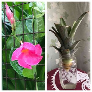 左📷 雨の中、マンデビラ開花…途中😆 ⋆̩☂︎*̣̩日差しが無いせいか、開ききらず(笑) 右📷 パイナップルの根出し🍍 昨年3月の時は、鉢にぶっ刺した😆だけで根付いたけれど、今回は水耕から挑戦💪