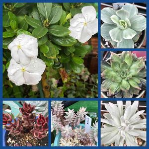 左上📷 今日のお花 ニチニチソウ😁 先程、土砂降り;(´•௰•`)☂の中、撮影😅 この子は2度の冬越しをしたスタンダード仕立て❣️ 先月は賑やかに咲いていたのに、☀️不足のせいか疎らに😅 いや、冬から咲いていたから、お疲れ気味かな😆 幹が木質化しています。 右上から下に *ピーチプリデ錦 *スノープリンス(ブラックプリンスの斑入り)渋すぎて、もはやプリンスでは無い🤣 *立田錦 *カメレオン錦 *チョコレート錦(この子は小さい花屋さんで購入したけれど、何故か今、二和園に大量にある😆二和園にしてはお高めの価格かも😅) カメレオン錦って、セダムのアレ😅に似てる! ほら、アレ…( •́ㅿ•̀ )?