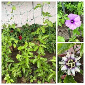 令和元年だから、頑張ろう!シリーズ② &今日のお花 トケイソウ😁 昨年の今頃は、パッションフルーツを収穫していたのに、今年は花さえ咲いていない😭 冬越しの為に鉢植えにする時に、失敗したかな😅 梅雨寒のせいにして(笑)、これからに期待‼️ 右上📷は、一緒に植えてある琉球アサガオ❣️ 葉がアサガオらしくないので、購入(笑) 雨でも夕方まで咲いています。 右下📷は、昨年に撮ったトケイソウの花😅