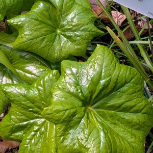 ツワブキの葉の様なツヤのある葉っぱに出会いました💚 ハッカクレンとありましたが漢字表記は「六角蓮」になってました😅