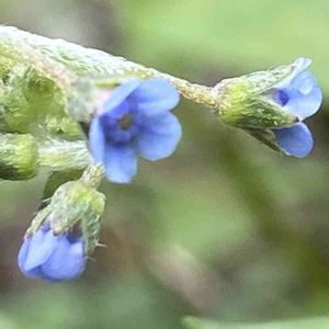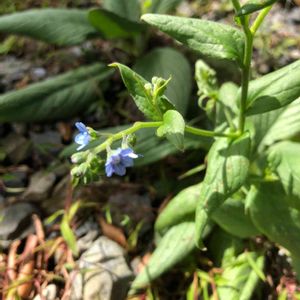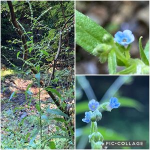 山の広い沢沿いで見かけました。 とても小さな小さな花でした。 種が庭にある、シノグロッサムと同じようくっつく種の型なのに、ビックリ、原種ってこうして小さくひっそりさいてるんだろなー 🌱オニルリソウ。と教えて頂きました^ ^ 在来種です。 🌱ムラサキ科オニルリソウ属、越年草。 40〜120センチ、花6〜8月 花は0.3センチほどでした。 🌱全体に蜜に短い圧毛があるそっくりな オオルリソウというのもあるようです。