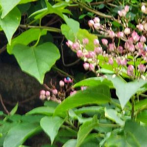 良く日のあたる西むきの石垣の上から出ているツルに咲いていました❗ 小さなピンクの花の真ん中にブルーの実か花が付いていました! 何という花でしょうか? お彼岸の頃に咲いていました!