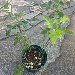 どなたか、剪定について教えて下さい😥 10日ぐらい前に買ってきたミニ薔薇、 もう葉っぱが黄色くなったり黒い斑点(黒星病)が出たり枯れ気味に。。 写真はそれらの葉っぱを切り取った後のものです。このままの状態だと縦長に伸びて行くような感じがして、、 低く丸みを帯びたミニ薔薇にしたいのですが、今のこの状態で土表面から10センチぐらいの高さでバッサリ丸刈りにしたらダメでしょうか???