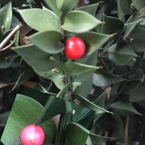 散歩道で (2/1撮影) 赤い実がひとつだけ残っていました。 すずはなさんより教えて頂きました。 ありがとうございました😊 ナギイカダ(梛筏):キジカクシ科ナギイカダ属 常緑小低木 雌雄異株 葉のように見えるのは枝から変化した葉状枝(仮葉枝、偽葉) 葉状枝が梛の葉に似ていて、花を乗せた様子が筏のように見えることが和名の由来