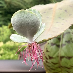 【カランコエ属 ガストニス ボンニエリ】 Kalanchoe gastonis-bonnieri 別名 雷鳥・ドンキイヤーズ 葉先にひとつずつ真っ白な子を 宿していましたが、 とうとう親離れさせました🐤 別名の【ドンキイヤーズ】は、 垂れ下がった葉の形が ロバの耳に似ているからでしょうか? 色と独特な模様から【雷鳥】と 呼ぶ方が馴染みがあります 沢山の別名があるらしく 「ジャイアントカランコエ、グッドラックリーフ、ライフリーフ、ライフプラント、ミラクルリーフ、パームビーチベル、スプラウトリーフプラント、スプラウティングリーフ、ツリーオブライフなど」 【SMGROWERS】から抜粋 https://www.smgrowers.com/products/plants/plantdisplay.asp?strLetter=K&plant_id=3425&page=