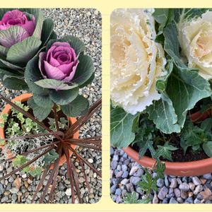 【葉牡丹寄植え】 圃場に育ち過ぎた奇形ちゃんが…と案内してもらって、奇形ちゃんのかわいいこと🥰 パンジー&ビオラ目当てだったから購入予定では無かったのに ・紫の方はリーフのみ スカスカ😅 《コルジリネ、プラティーナ、斑入りグレコマ、シルバーへデラ》 ・白の方はパンジーとアイビー 花ない😅 《パンジーたしかブルー系》 また鉢が増えてしまった😁 今後が楽しみ😊