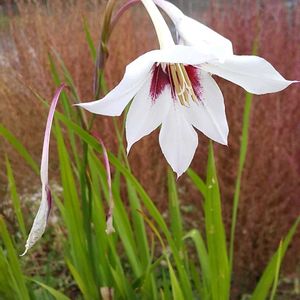 グラジオラス 白 全くの独り生え シランをカットした間から生えてきました。 小さな球根がいつ落ちたのか、2枚目のように細く生えていて、知らないうちに育って花が咲きます。