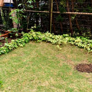 芝生の周りのアイビー!ほっといたらいい感じに、周りを囲んでくれました(^○^) 一部、芝がはげてたのでそこを耕し種をまきました。芝復活してほしいです☆彡 除草剤を撒いて芝生以外の雑草がなくなり綺麗になりました。゚+.(・∀・)゚+.゚イイ!!