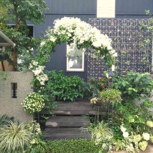 仙人草のアーチ 満開になりました 今年は ノリウツギ (枝垂れてるけど💦)と ベコニアのハンギングで 白花コラボ 出来ました✨✨