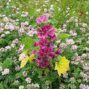 こんばんは🌃今日も一日お疲れ様でした✨ 去年は虫さんにたくさん食べられたマロウ🌸 今年は野草に守られて、スクスクと育っています😊