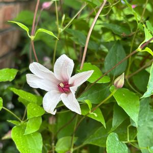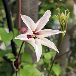 クレマチス プリンセスケイト 我が家もやっと開花♡︎ᵎᵎᵎ♡̷︎♡⃜︎♡⃡︎🎶 細い茎で成長も遅く諦めていたところ、なんとか小さな蕾が見えてホッとしましたが、それからがまた長かったぁ😅💦