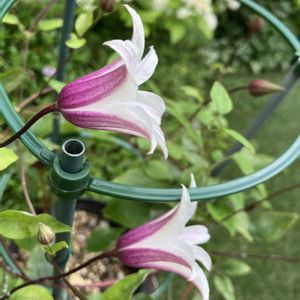 まだまだ🔰💦 クレマチス プリンセスケイト (テキセンシス系 新枝咲き) わが家には2株のケイトさんが居ますが、トレリスに誘引したこちらのケイトさんは、ツルがトレリスを越えて空中をさまよっています😂 ツルが長く伸びる子だから、広いフェンスなんかに誘引してあげたら、もっときれいな風景を作れるんでしょうね〜💦 誘引場所って難しい😅 Instagram tea_rose0910