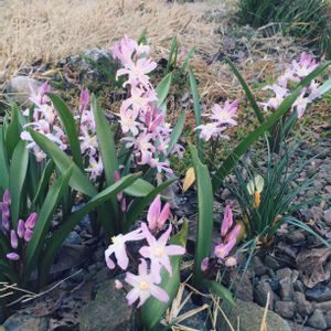 チオノドクサが庭中に咲いてます 雪が解けたばかりであきに残した枝葉がなかなか取り切れない庭が青と白で覆われてます。