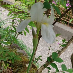 おはようございます☀️ 今朝 南側のお宅 外壁塗装のシートが外され 少し明るくなりました✨ シェードガーデンでこれから咲く紫陽花たちも明るくなります💓 今朝のお花は パープルのお花 1 クレマチス キリテカナワ 今年新しく仲間入り 思ったより濃いめの花色💜💜 2 アイリス 球根mixの中に入ってて 初開花です💜💛 3 ニオイバンマツリ 3年目の株 少しお花が増えました🎶💜🤍