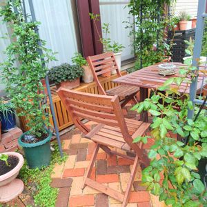 今朝のガーデンテーブル😊 このテーブルがバルコニーに来てから、立ったまま植え替えできるのでお花のお世話が本当に楽になりました💕腰が痛くなりません😆 季節が良い時はお茶もできます💕 バルコニーの立ち上がりで日陰になる面積も減りました。普段は小さい鉢🪴💐を置いて眺めています💗