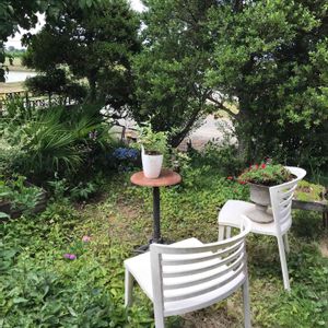自宅ゾーン改造計画? ゆくゆくはここにガゼボを置いて 薔薇を植えたい🌹 白い椅子あるだけで ガーデンぽく見えるけど荒れ放題な場所です
