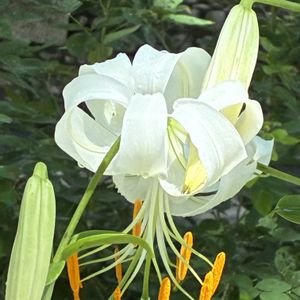 💚シロカノコユリ🤍 いつ植えたか全く覚えていません😓 毎年芽を出してお花を数輪咲かせます。 この形が好きという訳でもないし、カサブランカの方が好きなのにどうして植えたのかな(「๑•₃•)「 ʷʱʸ? でも白のカノコユリ、清楚でいいかな(✿╹‿╹) 『別名:シラタマユリ(白玉百合) 白カノコユリ(白鹿の子百合)はカノコユリ(鹿の子百合)の変種で、純白色の花びらをしています。 九州に自生しているカノコユリの中から発見されました。 紅色の斑点はありませんが、花びらに白い突起があります。』