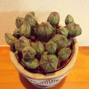 ■Euphorbia vol.5🐙 タコものシリーズ続けます。 fimbriata/フィンブリアータ 〈or mammillaris/マミラリス(鱗宝)〉 pseudoglobosa/プセウド グロボーサ(稚児キリン) knuthii/クンチー(狗奴子キリン) isladelpescadoによると「鱗宝」はmammillarisで、マミラリスの紹介ページには「非常によく似た見た目をしているフィンブリアータという種がいますが、園芸的に流通する上で両種は混合して扱われることが多く、正確に分類されることはほとんどありません。それにも関わらず、分類学的にも両者はシノニム(同種異名)とはされておらず、別種とされています」とあります。見分け方として、マミラリスは茎を株元から伸ばす、フィンブリアータは茎の途中から旺盛に分岐・小吹きする、マミラリスのトゲは約8mmだが、フィンブリアータのトゲは1.4cmほど、とあったので、これはマミラリスかもしれないです。ま、どっちでもいいんですけどね(-。-)y-~
